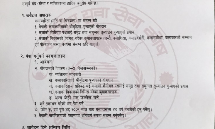 १. नेपाली कलाकारिताको श्रीवृद्धिमा पुयाएको योगदान ३. कलाको विकासको निमित्त गरेका कृयाकलापहरु (जस्तै, कलाशिक्षा, कलाप्रदर्शनी, कलासमीक्षा, कलाकारको सम्मान सेवा,